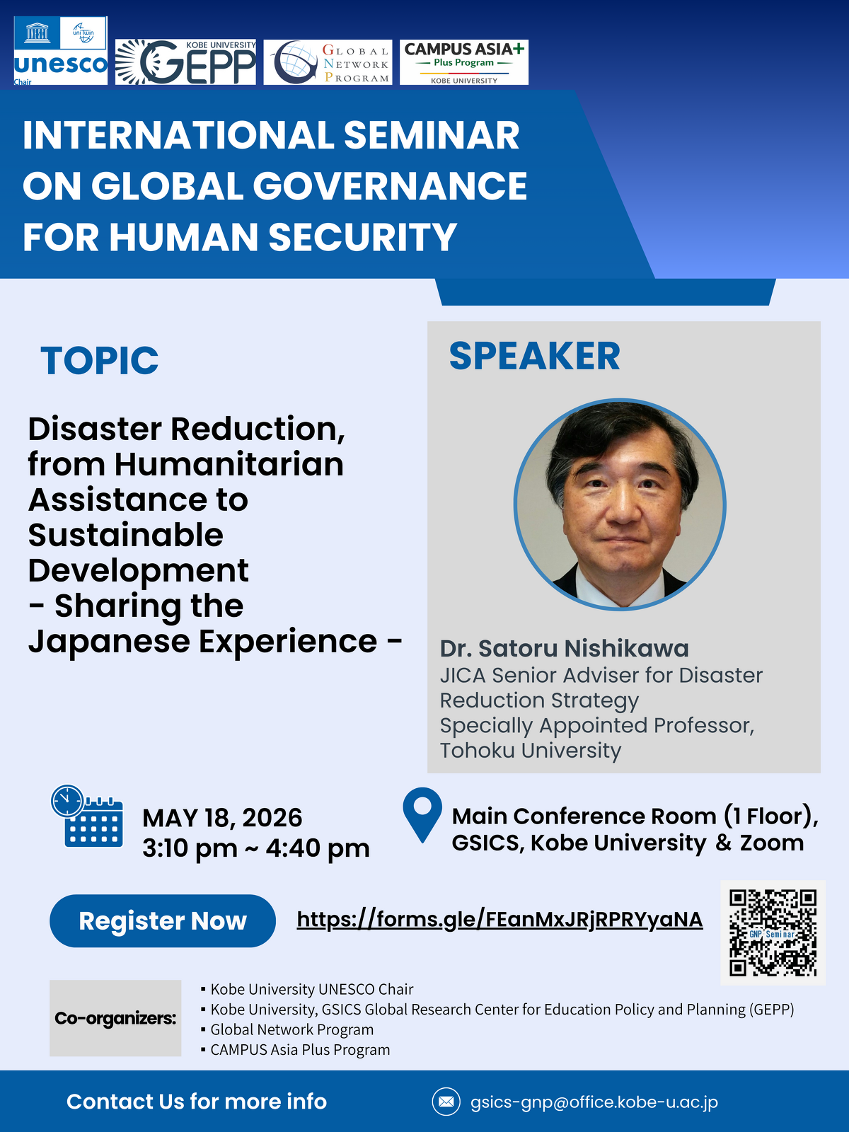 Information on International Seminar on Global Governance for Human Security (Monday, May 18, 15:10-16:40 (JST))